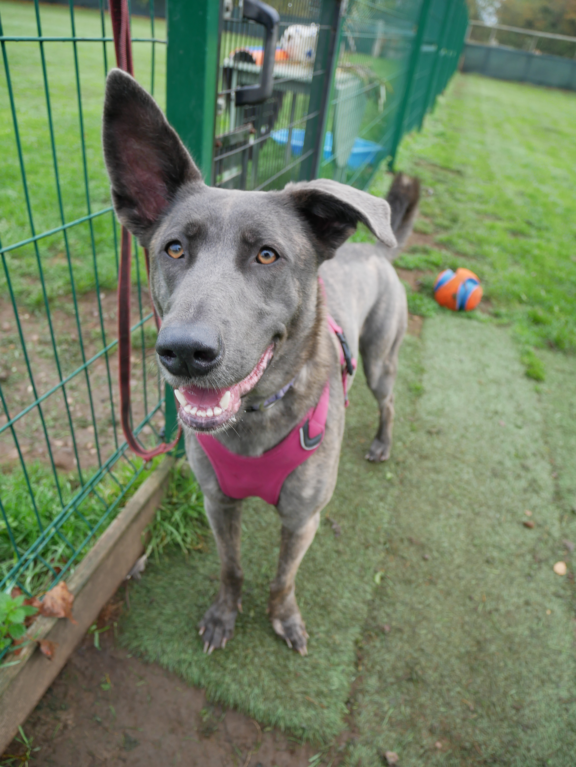 She is a friendly dog who is happy to meet new people. She greets them with a wagging tail and a wiggly bottom. She is a big, strong girl, but she walks nicely on a lead when there are no distractions. She also enjoys running around off the lead in a secure area. Her favourite things are food, toys and spending time with people!